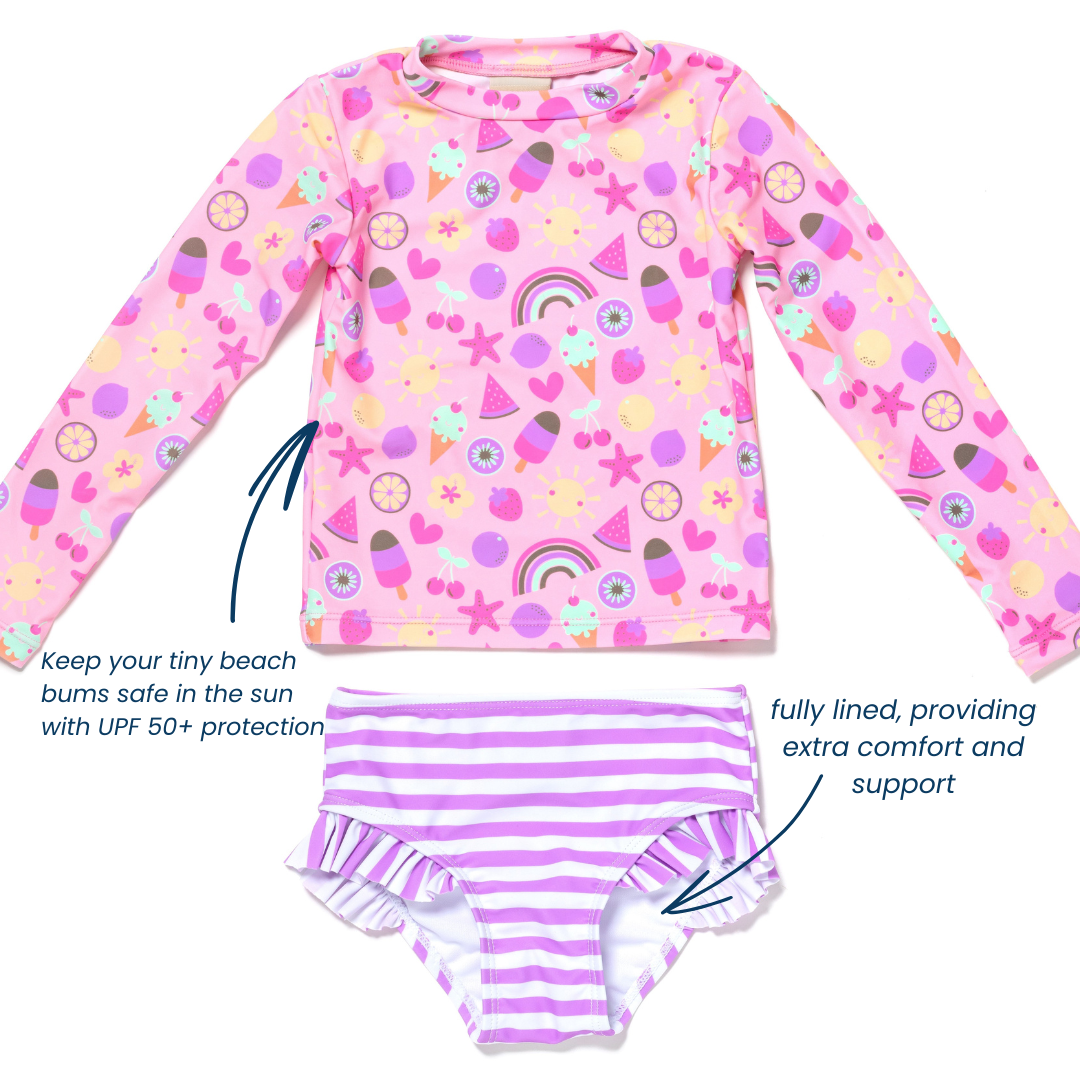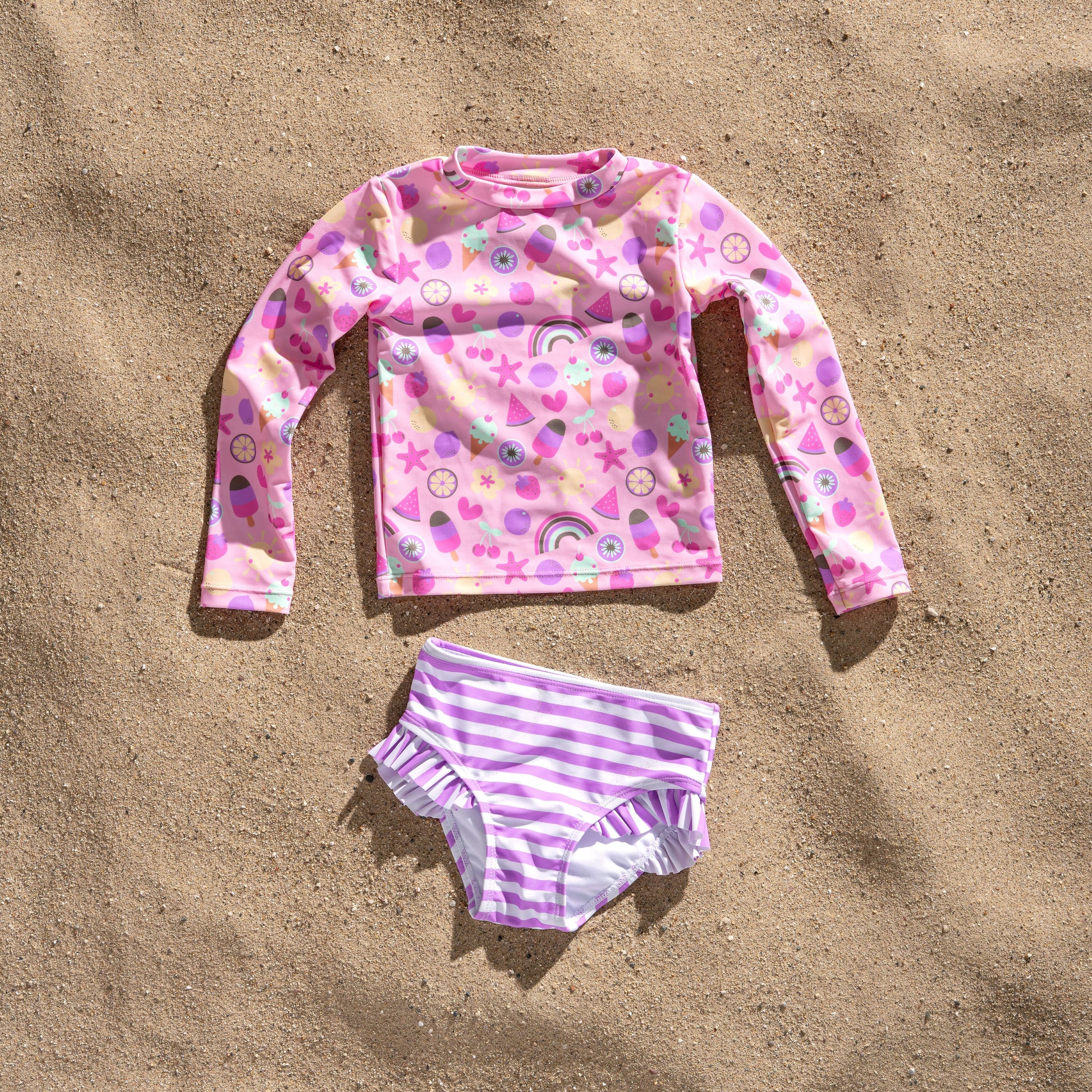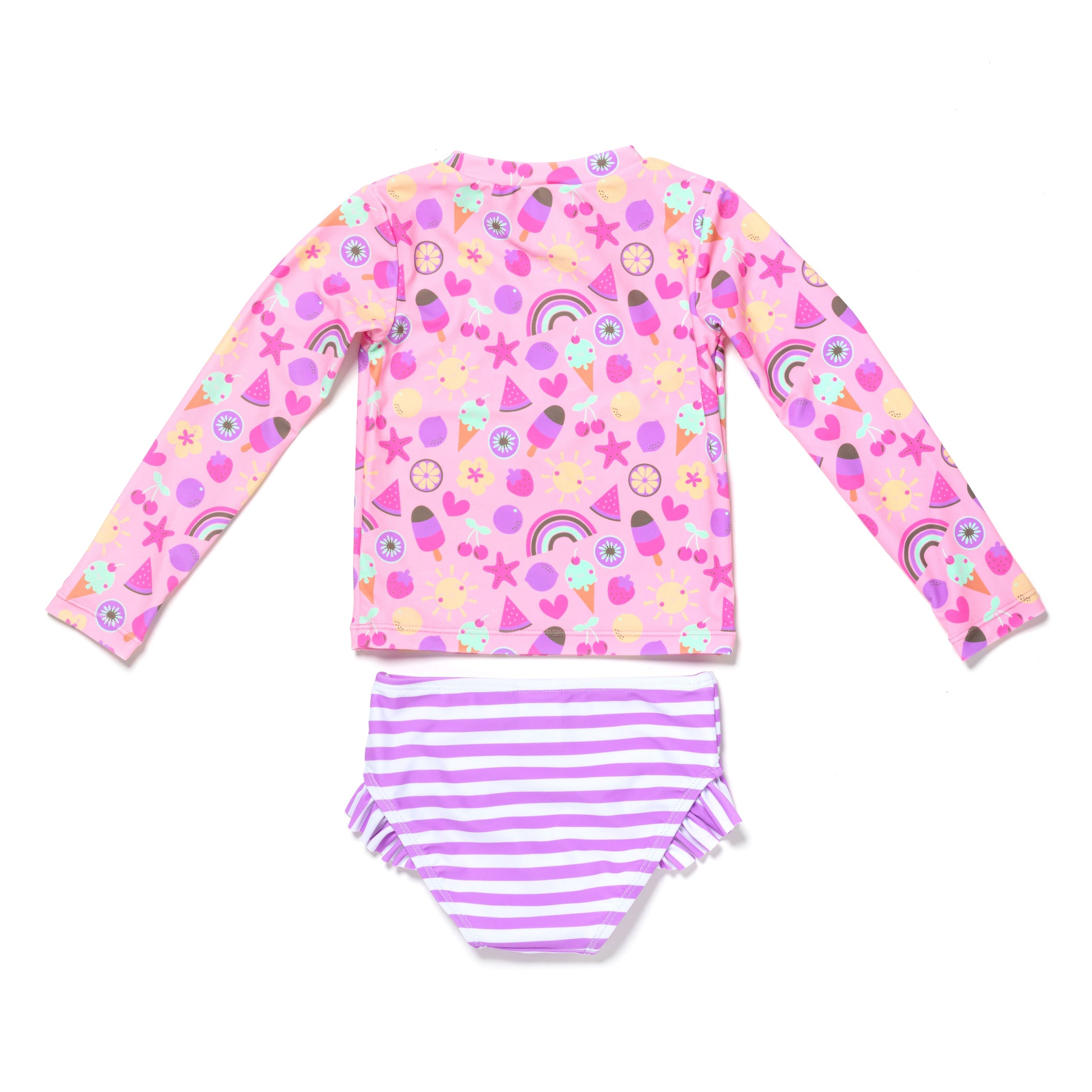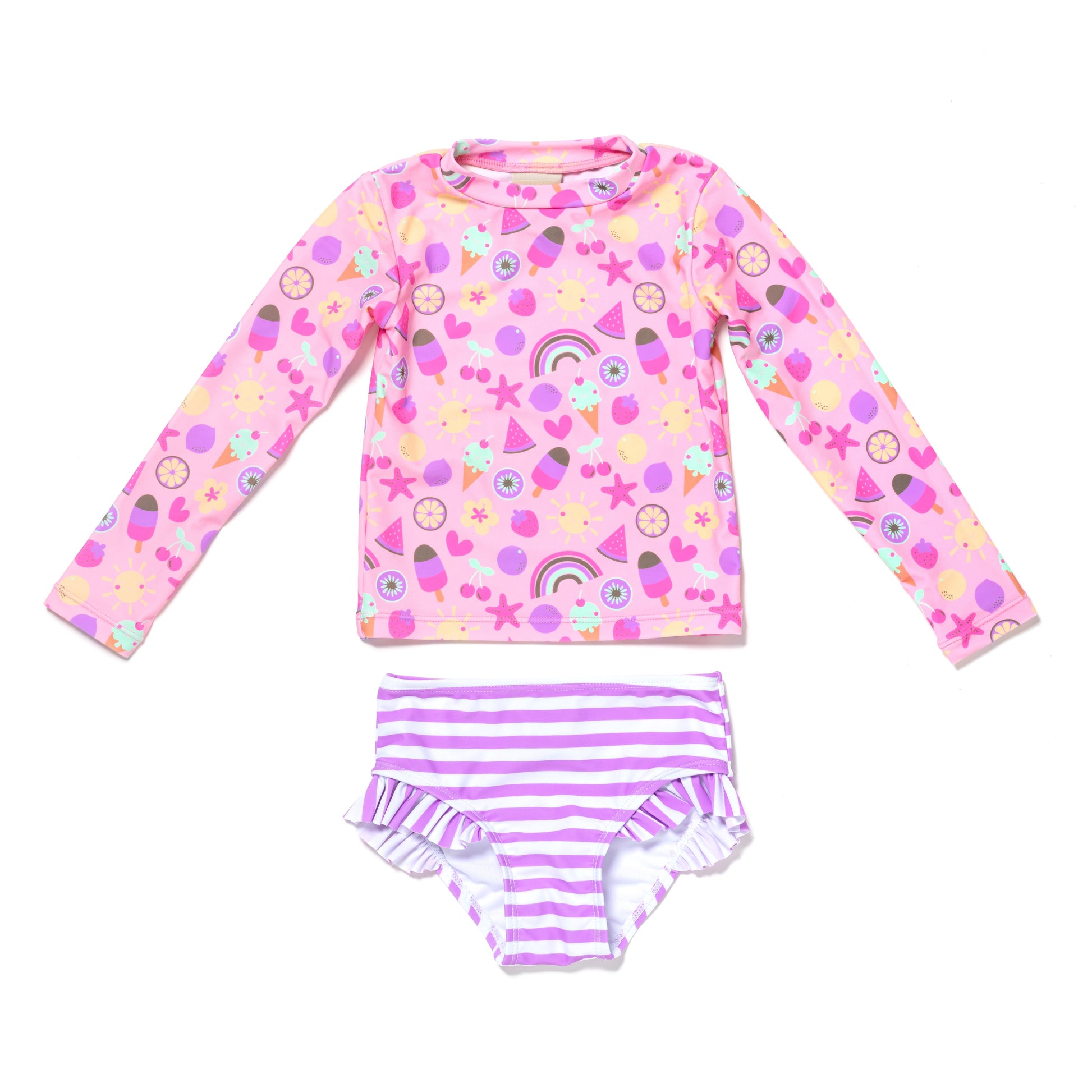 Baby and Toddler Girl Long Sleeve Rash Guard 2 Piece Swimsuit Set, Sweet Treats
